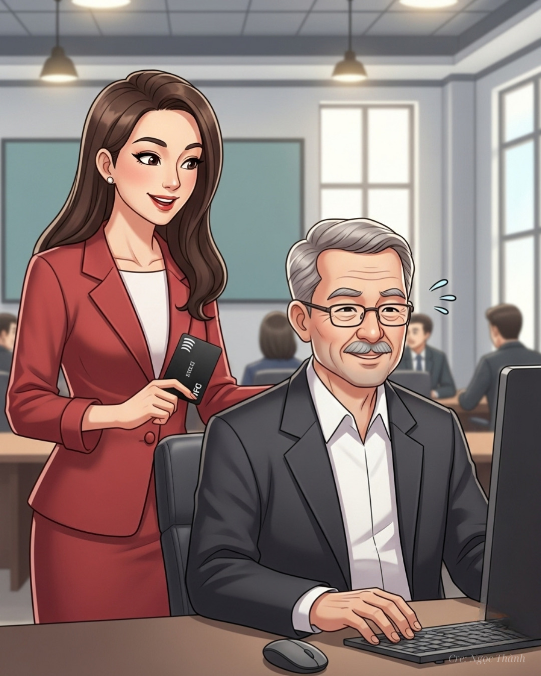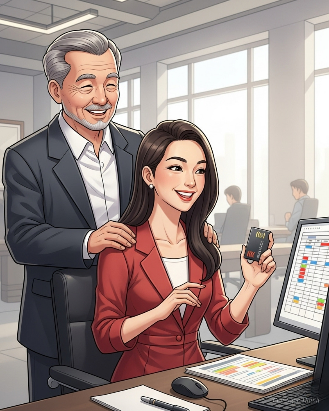 Rời quán cà phê, Linh tiếp tục hành trình đến văn phòng khách hàng. Tại đây, cô thấy Bác Hùng, một khách hàng lớn tuổi, đang cau mày nhìn vào bảng tính phức tạp với hàng trăm dữ liệu chằng chịt.Linh nhẹ nhàng tiến lại: Chào bác, cháu có thể giúp gì không ạ? Cô đưa chiếc thẻ thông tin cá nhân NFC ra. Khi Bác Hùng chạm điện thoại vào thẻ, màn hình hiện dòng chữ: Kỹ năng ẩn: Sắp xếp dữ liệu phức tạp. Ngay lập tức, Linh bắt tay vào sắp xếp lại toàn bộ bảng tính, phân loại dữ liệu, tạo biểu đồ và trình bày khoa học.