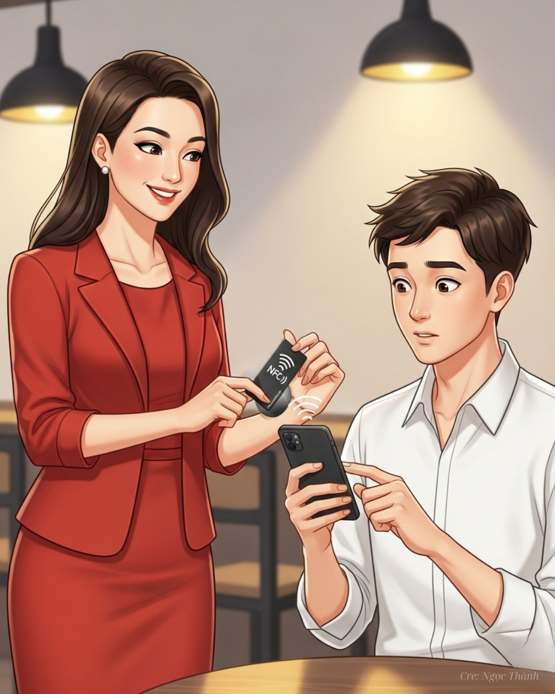 Linh tiến lại gần, mỉm cười thân thiện và nói: Chào bạn, tôi là Linh. Có vẻ bạn đang gặp chút rắc rối? Đồng thời, cô đưa chiếc thẻ thông tin cá nhân NFC của mình ra.Bạn hãy thử chạm thẻ vào điện thoại của mình nhé. Chàng trai, tên Minh, hơi ngập ngừng nhưng rồi cũng làm theo.