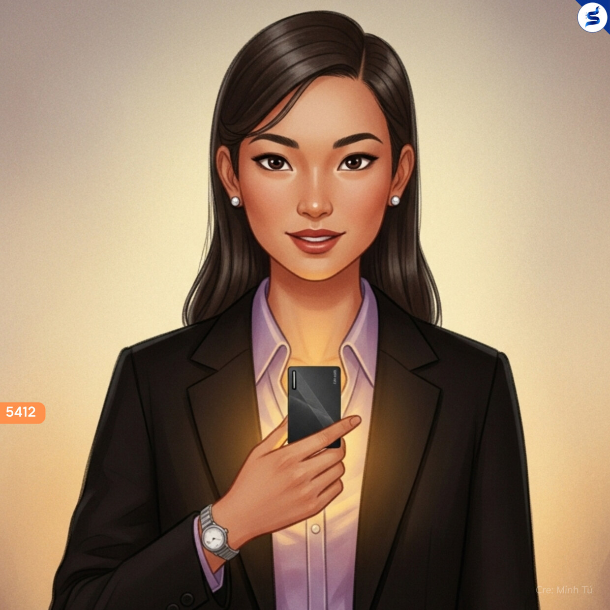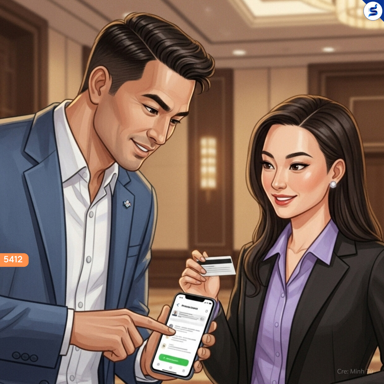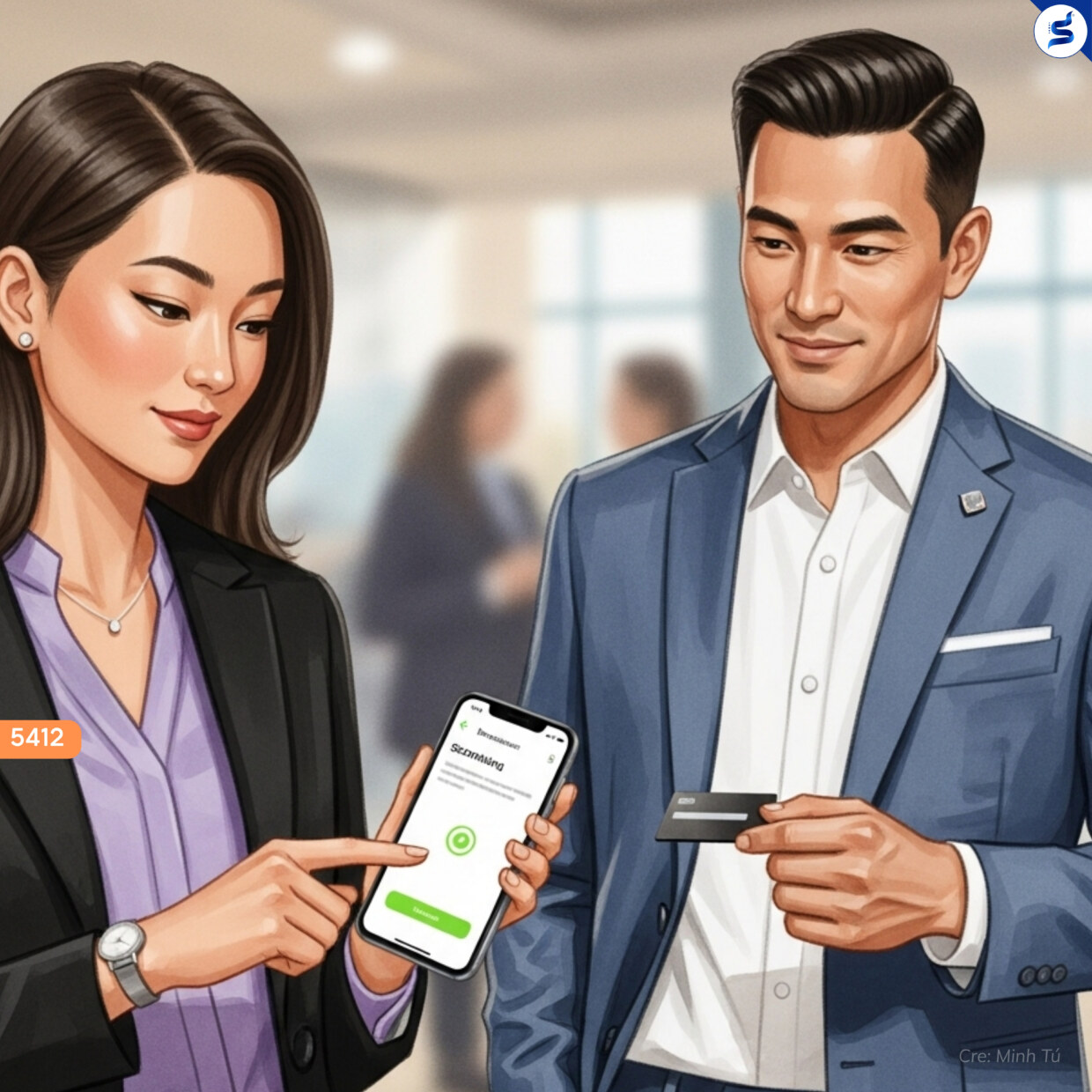 Tố Uyên chìa chiếc danh thiếp giấy được in lụa cẩn thận. Khôi Nguyên rút ra một chiếc thẻ kim loại nhỏ, màu đen tuyền. Tố Uyên liền cầm điện thoại quét mã QR trên chiếc thẻ, và ngay lập tức trên điện thoại hiện lên đầy đủ thông tin của anh.